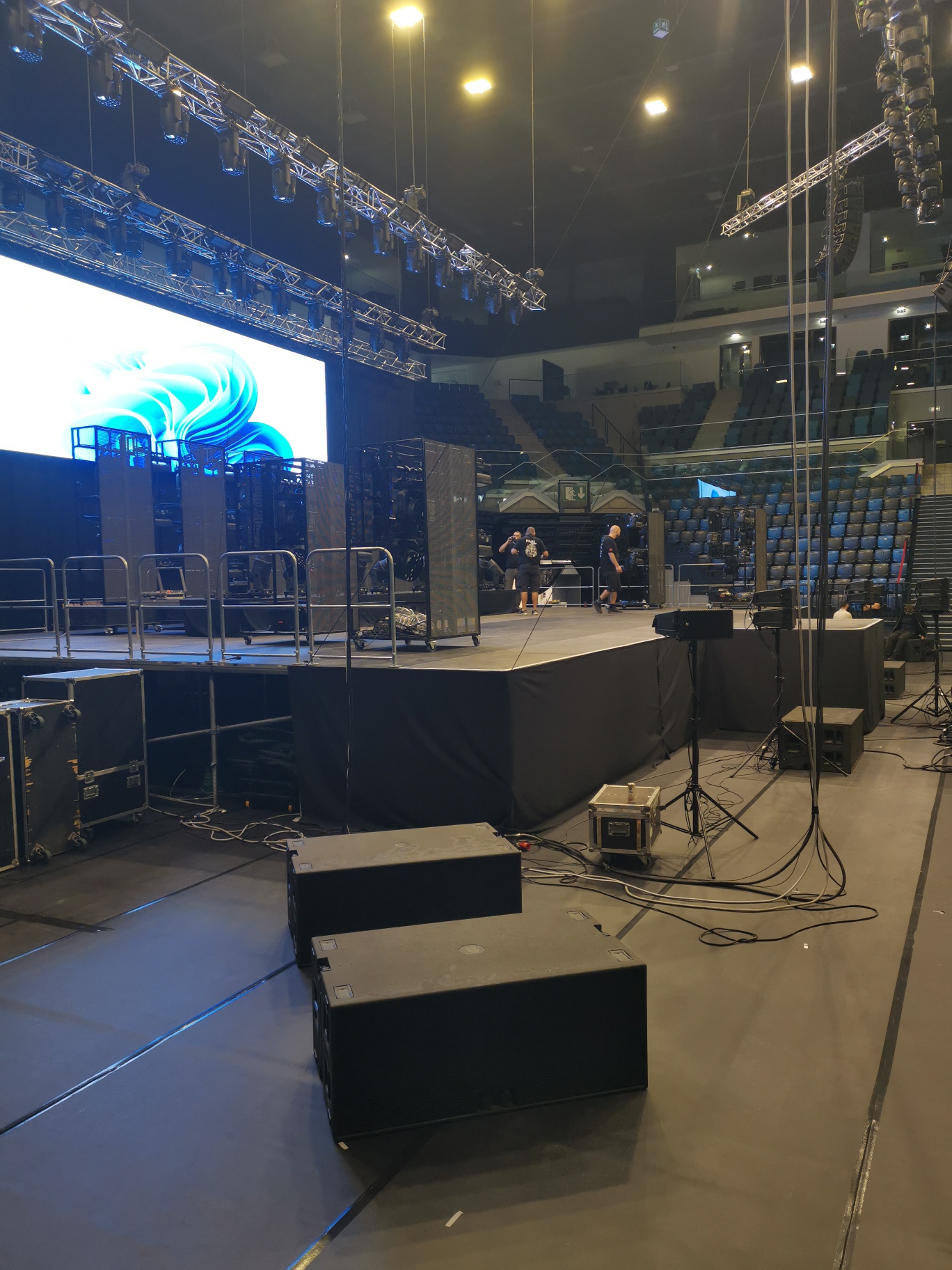 A terem hátsó zónáinak erősítése külön figyelmet kapott: a LED Cube mögé egy hátsó array is került, szintén HDL30A elemekből, összesen 6 darab egységgel, 10,5 méteres magasságban. Ez a kiegészítés biztosította a kiegyenlített lefedettséget a nézőtér teljes hosszában, még a legutolsó sorokban is pontos és dinamikus hangzással.